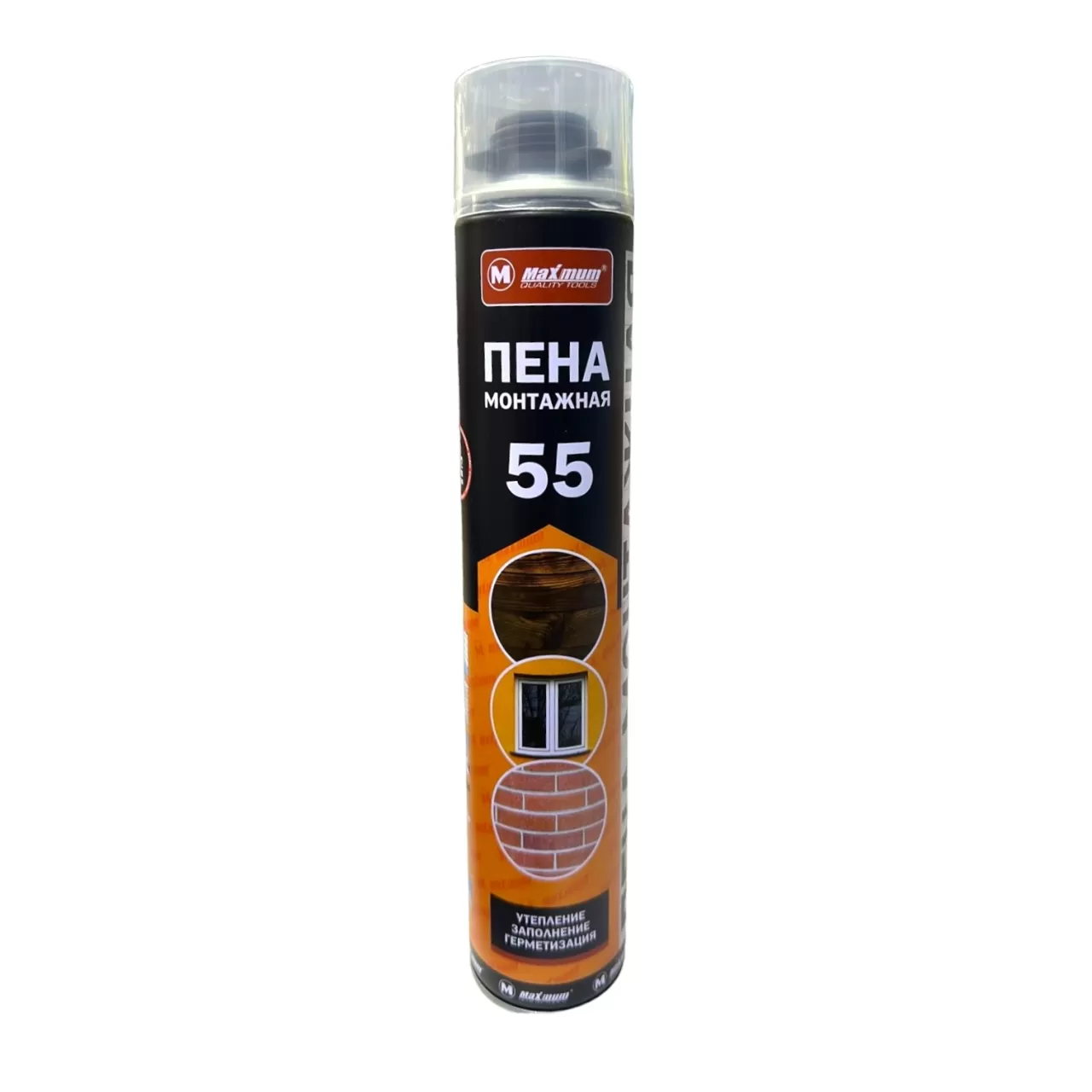 Пена монтажная пистолетная 55 л 750 мл от бренда Maximum из серии Construction Универсал используется для фиксации, изоляции окон и дверей, также это отличный материал для тепло и звукоизоляции. После затвердевания не огнеопасна и не токсична.