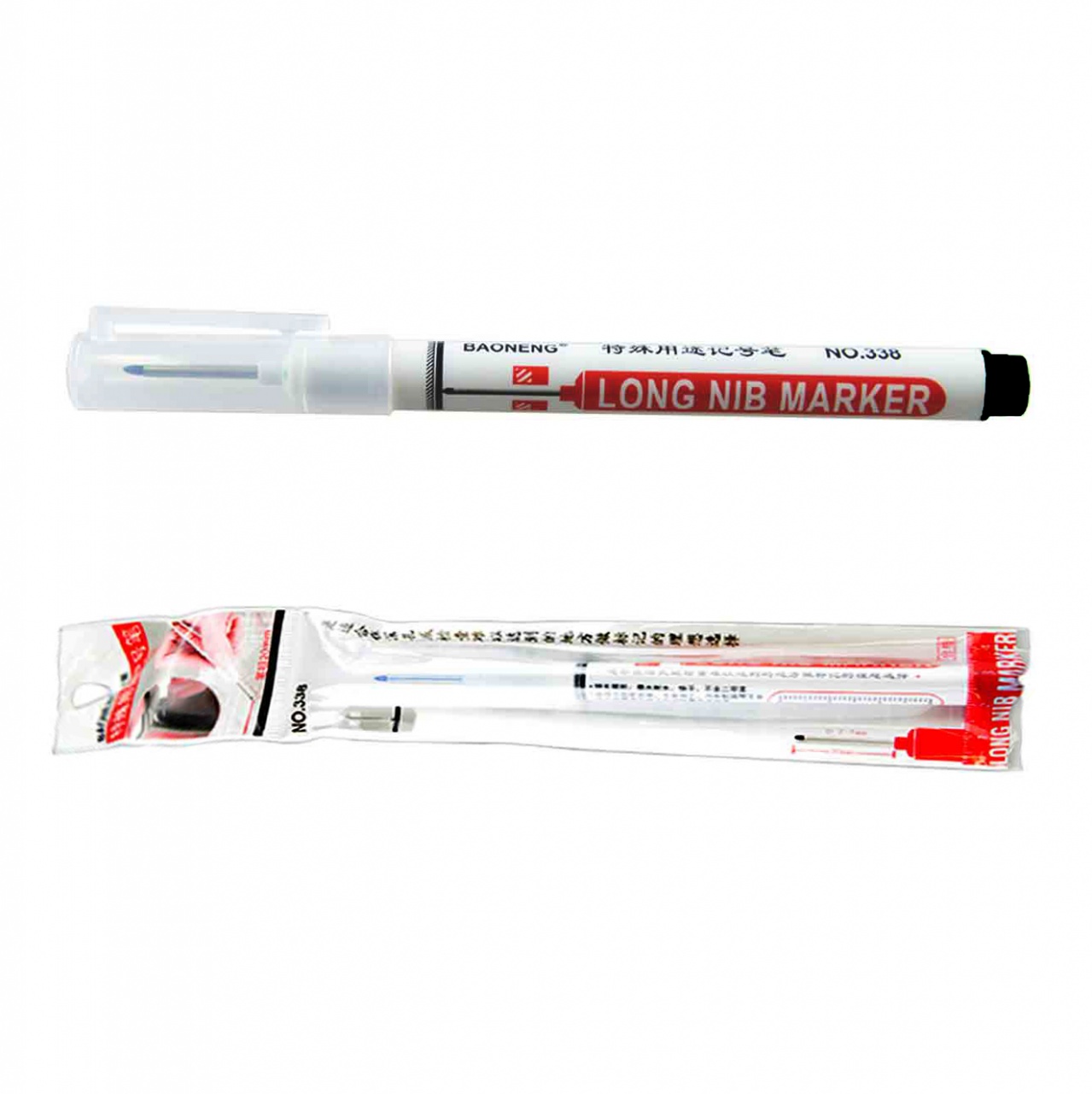 Маркер для отверстий и труднодоступных мест имеет толщину стрежня 0,7-1 мм. Используется для разметки отверстий при сверлении, а также различных столярных работах. Алюминиевый прочный корпус, с нанесенной линейкой для быстрого измерения метизов. Тонкий металлический стержень длиной 30 мм заправляется чернилами на водной основе, которые прекрасно пишут на любых поверхностях: на стекле, резине, пластике, дереве и металле. Длинный сменный наконечник устойчив к деформации. Маркер выполнен в различных цветах.