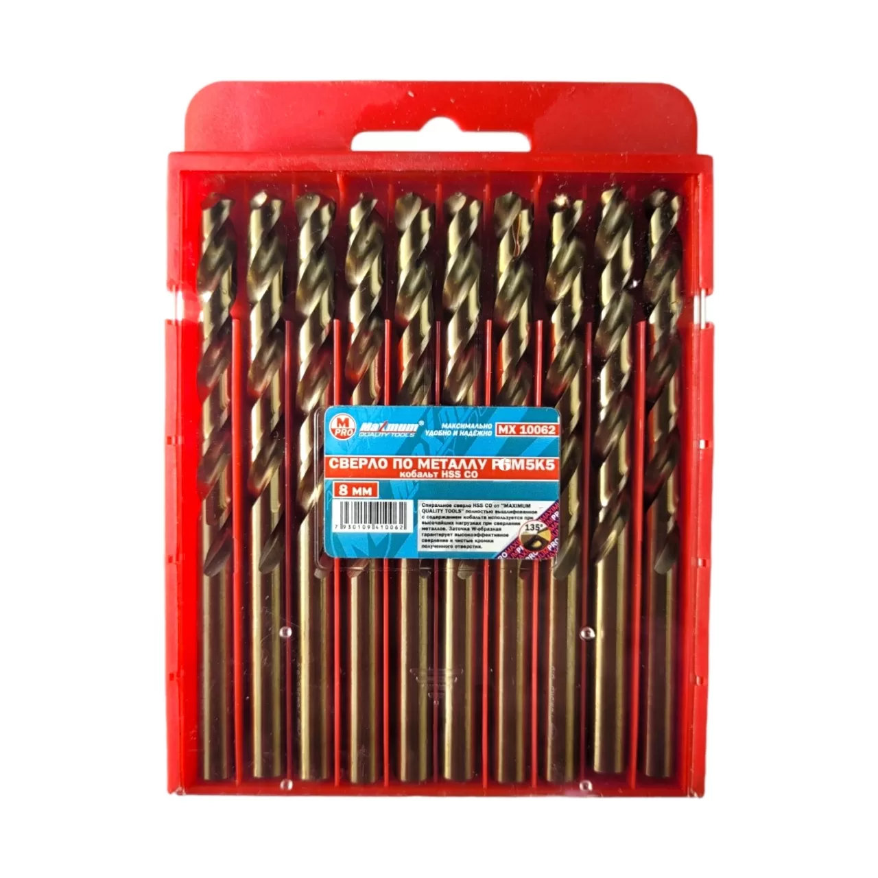 Сверла кобальтовые HSS из стали P6M5K5 от «Maximum Quality Tools» имеют цилиндрический хвостовик и общую длина: 120 мм. Рабочая часть 70 мм закручена вправо. Сверло HSS CO 8 мм из кобальта применяется для нержавейки, титана, легированных сталей, чугуна, дерева. Добавление кобальта придает дополнительную жаропрочность – выдерживает температуру до 620-630°С. Обеспечивает быстрое и точное сверление отверстий. С данной оснасткой можно работать на повышенных скоростях резания – до 20 м/с.
